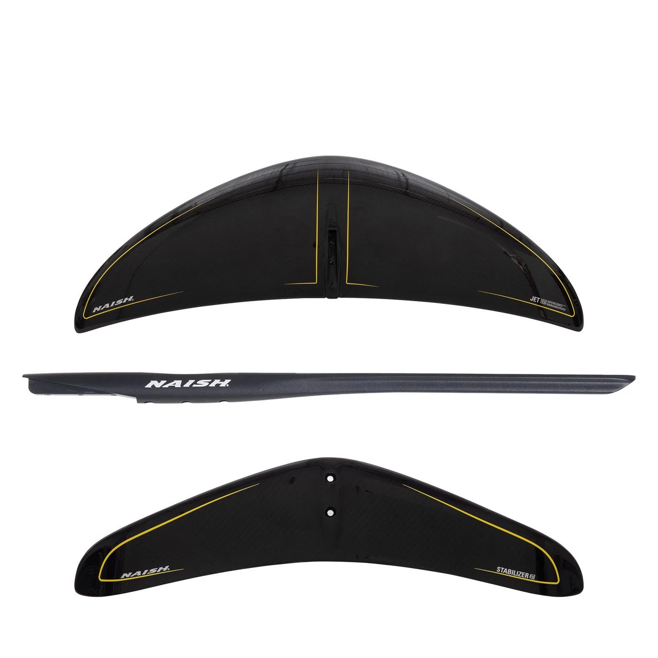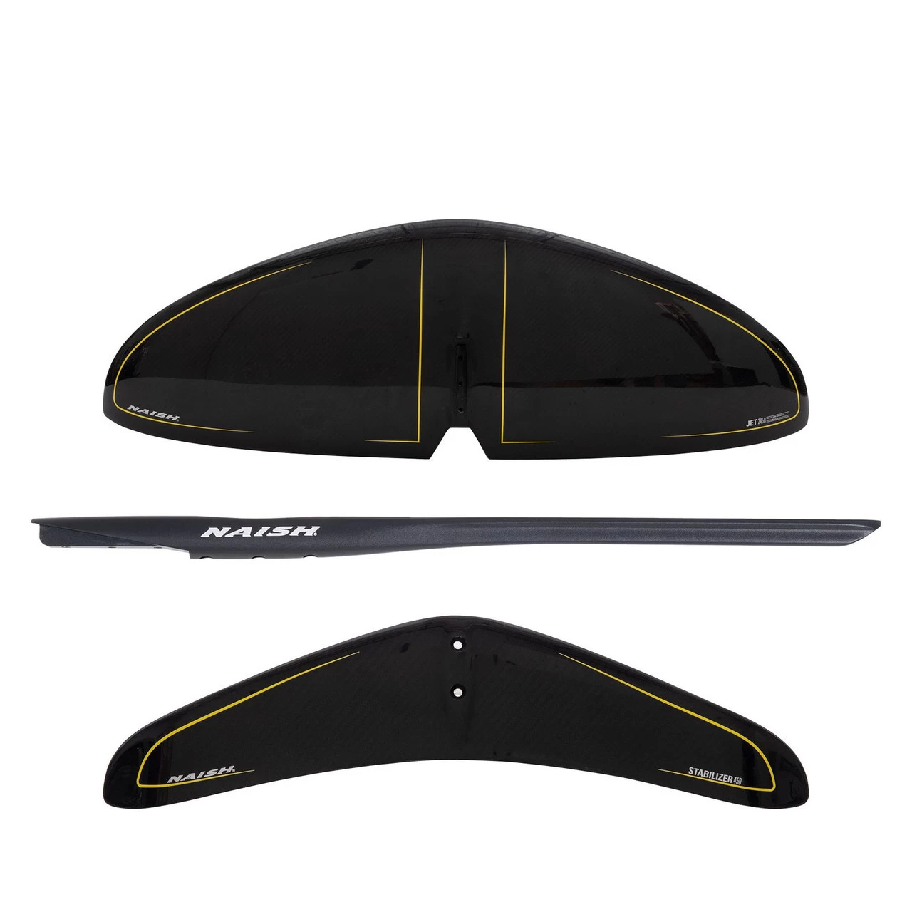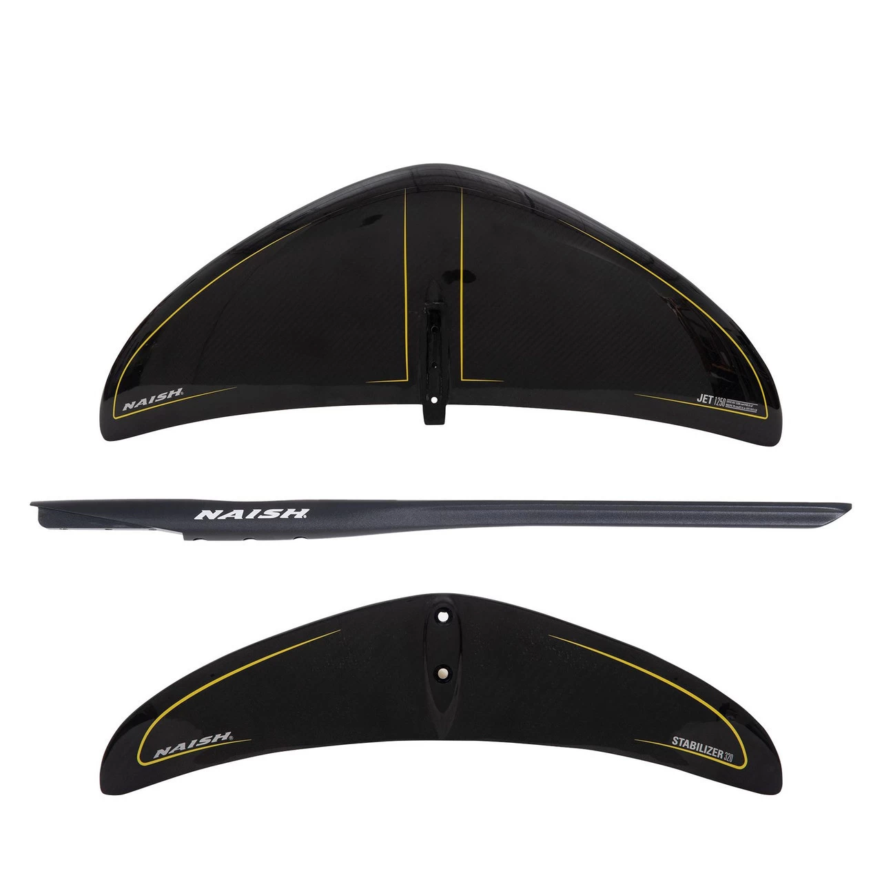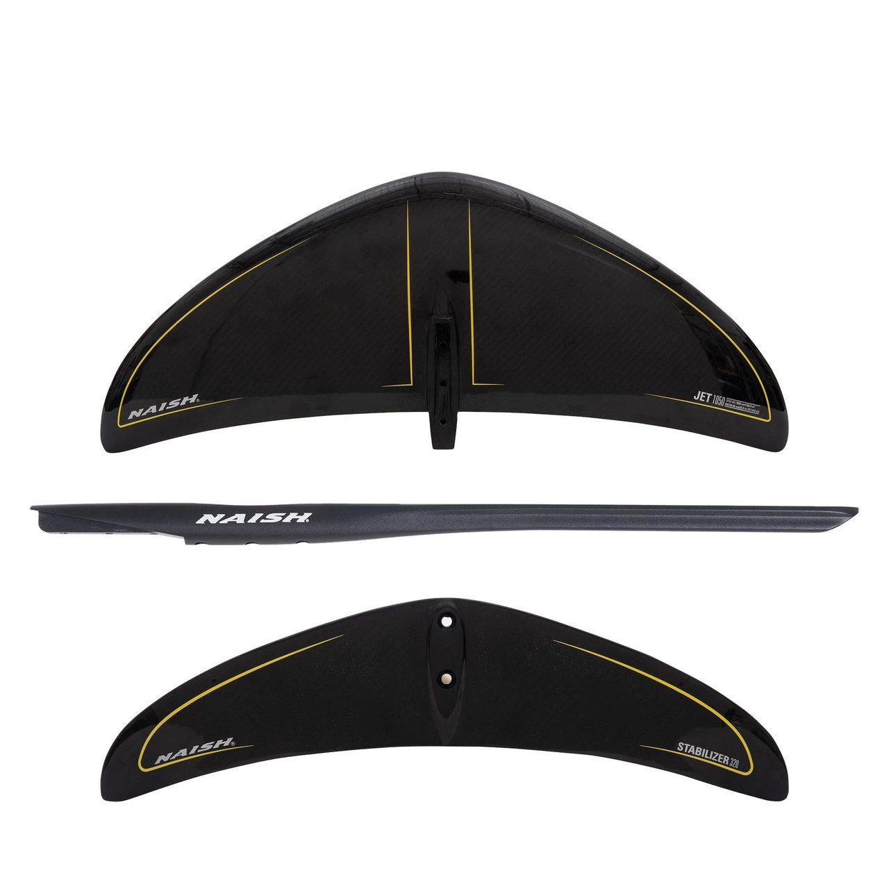 Naish Jet foils feature a medium aspect ratio delta-wing planform with moderate anhedral to deliver the optimum combination of early lift, speed, and turning ability. These wings are the ideal choice for foil surfing as well as a wide range of disciplines from windsurfing and wing-surfing to downwind kite foiling. The 1050 and 1250 are the go-to sizes for surf foiling in faster, steeper surf. These wings are also an excellent option for light wind kite foiling and windsurf foiling on crossover style boards. These wings are paired with the Stabilizer 320 back wing, which gives the complete setup more intuitive turning and response for pumping.