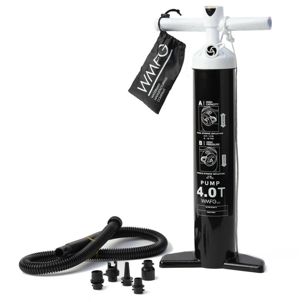 As the originator of the big, tall, oversized, kiteboard pump WMFG is proud to introduce the third generation pump 4.0T! WMFG was the first “tall” kite pump on the market and has always been the most feature-rich, kite pump with the best selections of nozzle, the best hose available, and at the leading edge of pump tech. The new and improved extra big, tall, high volume 4.0T kiteboard pump takes all the fight out of kite inflation. Easier, faster, and better ergonomics.